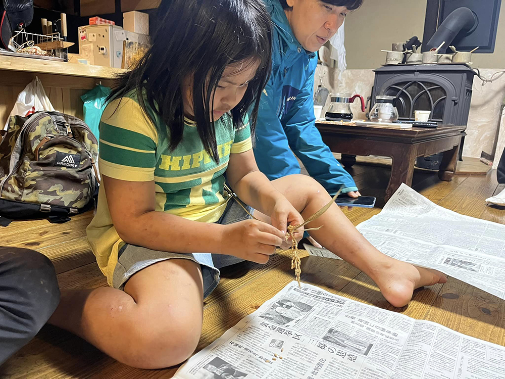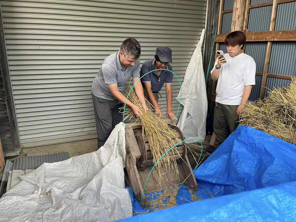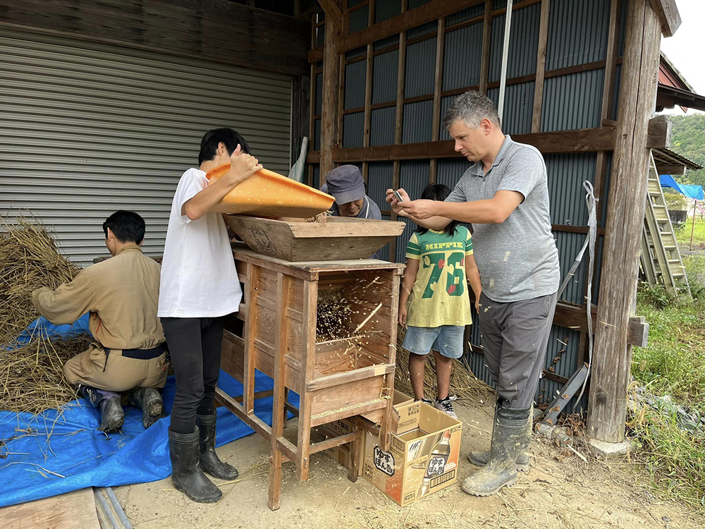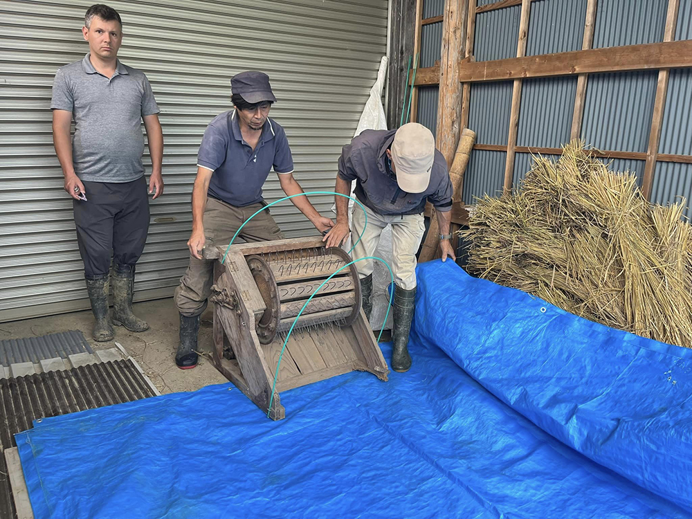 午後は屋根の下に運んでおいた乾いた稲穂を脱穀しました。