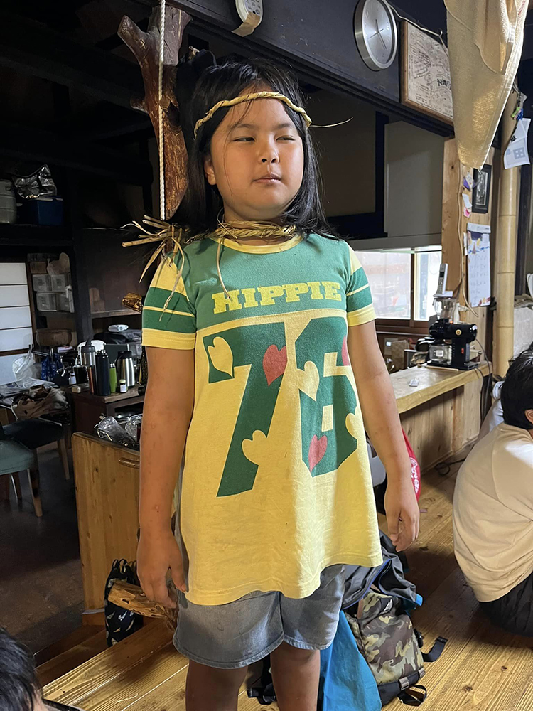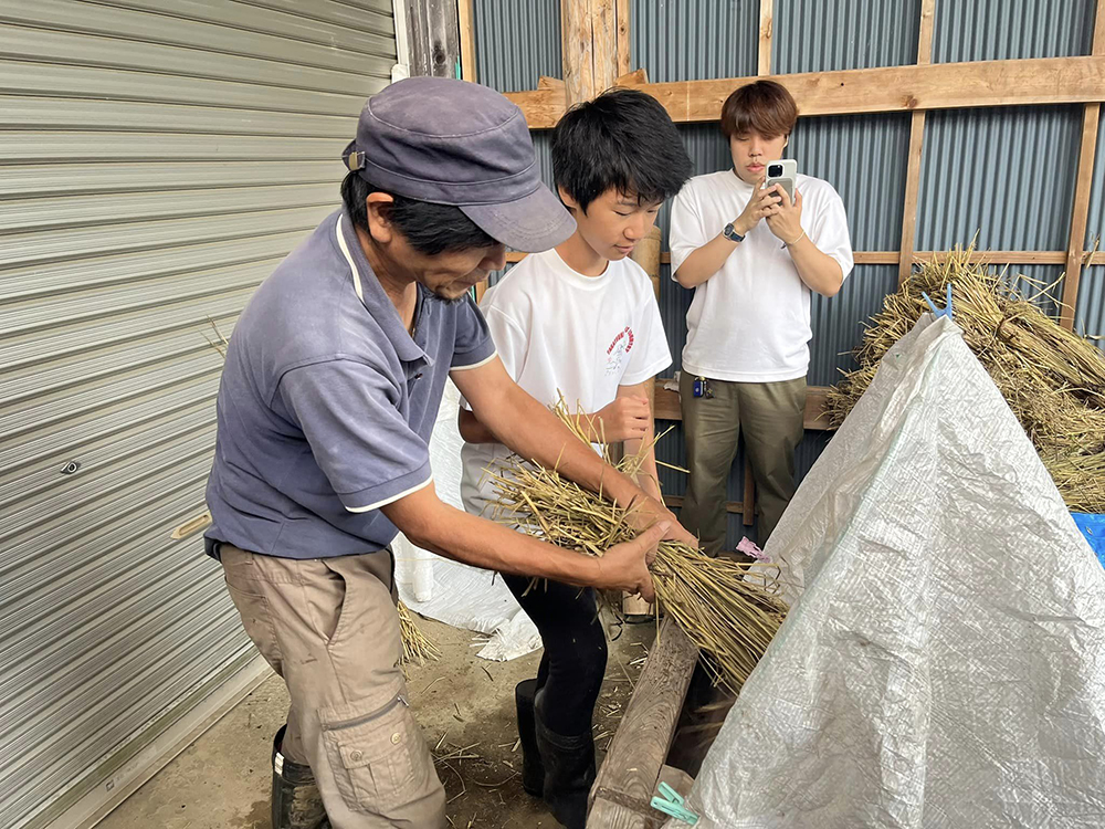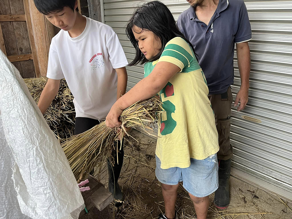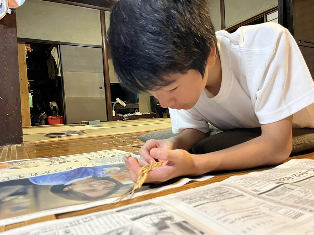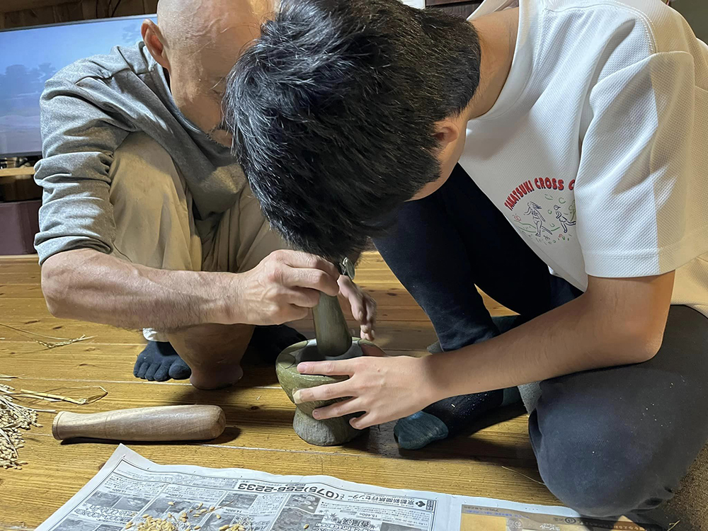 午後は屋根の下に運んでおいた乾いた稲穂を脱穀しました。