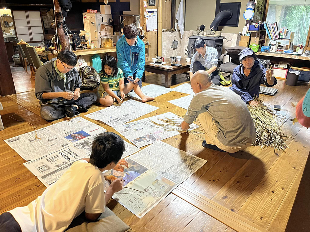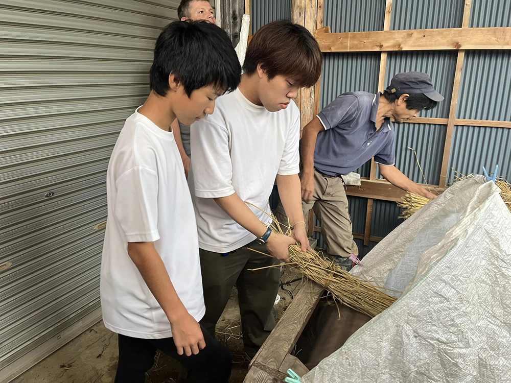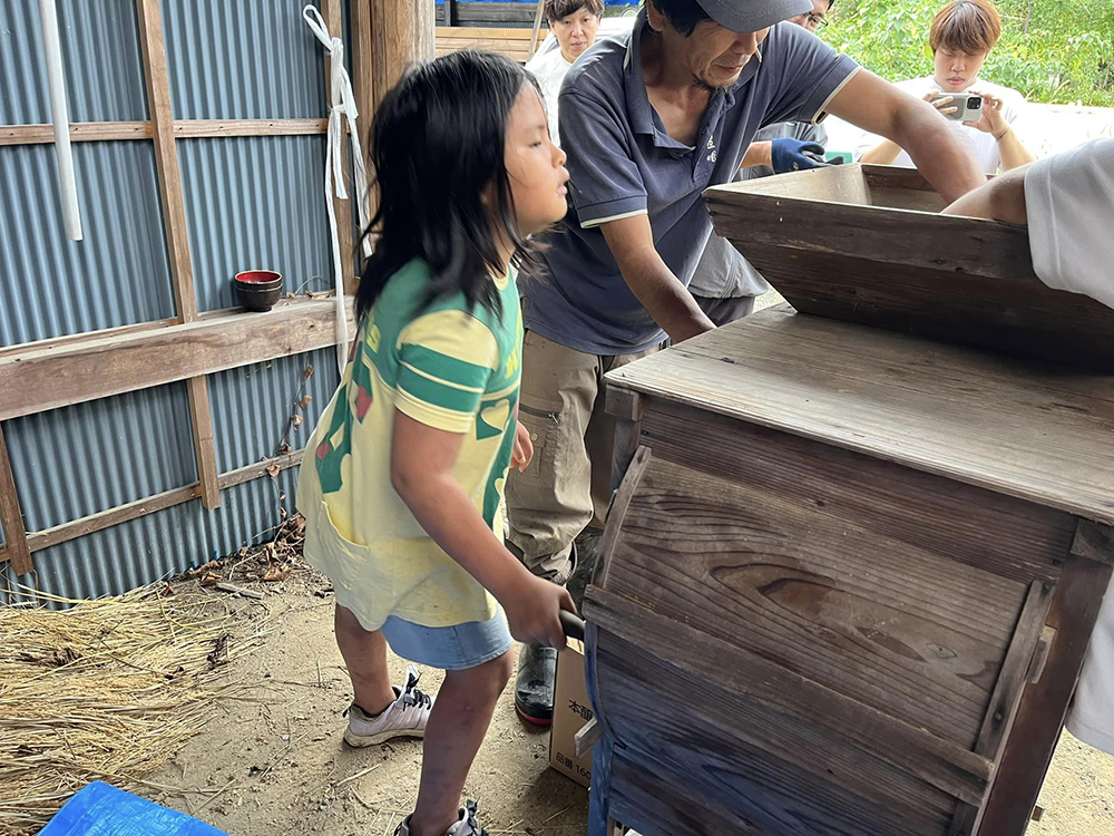 次は「唐箕(とうみ)」を使って余分な細かい藁やゴミを飛ばす作業。