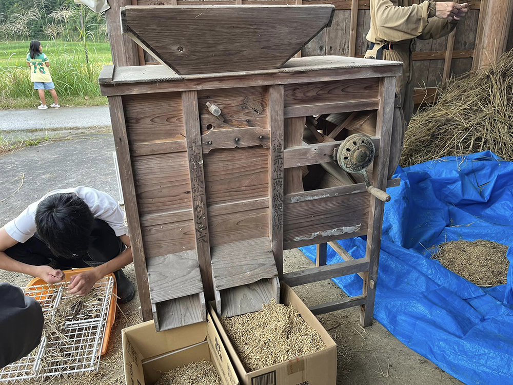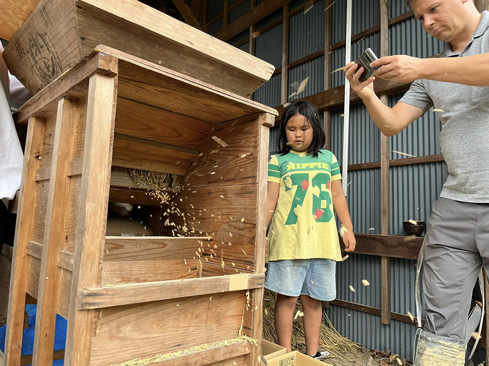 「足踏み脱穀機」で稲穂からお米を弾き飛ばします。