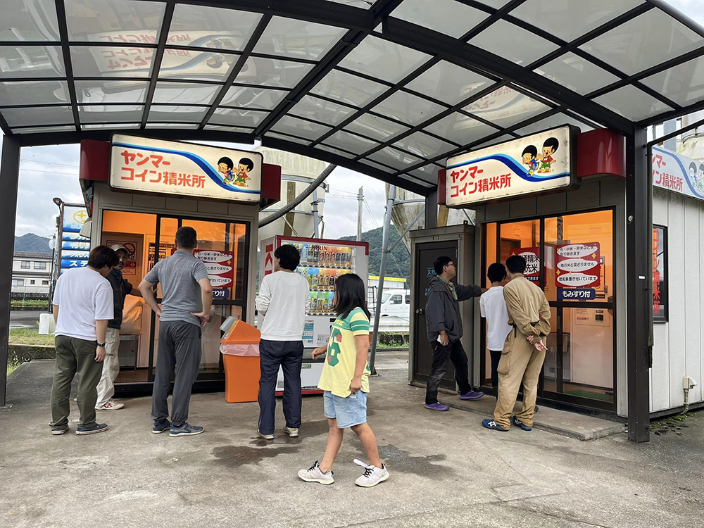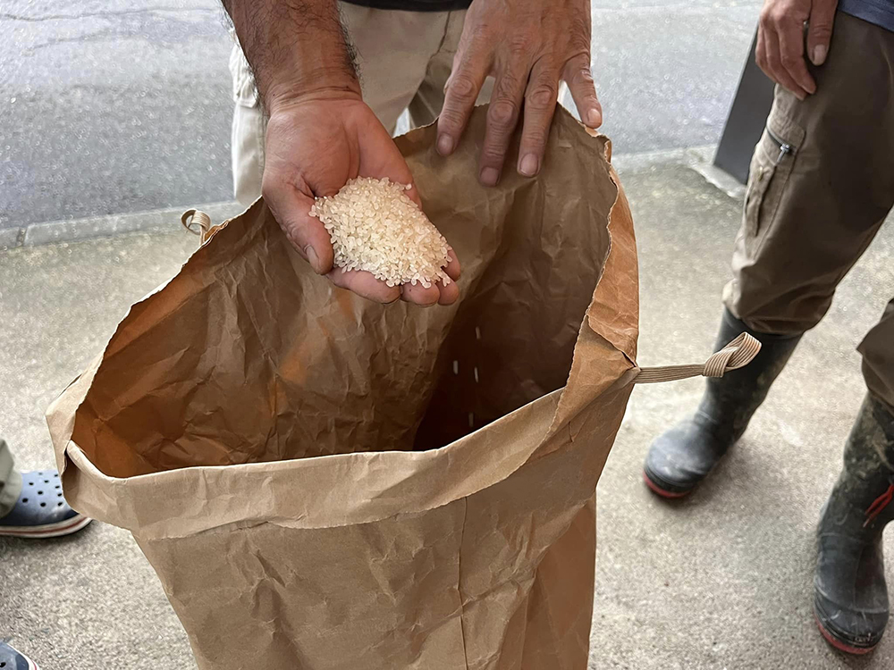 作業後、この日はそれぞれ都合で参加者が少なめでしたので、みんなで車を乗り合わせて綾部市内にある籾から白米にしてくれる精米所に行ってきました。