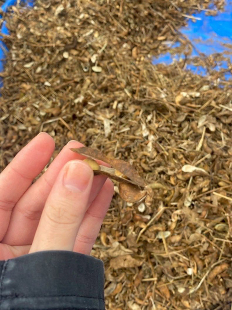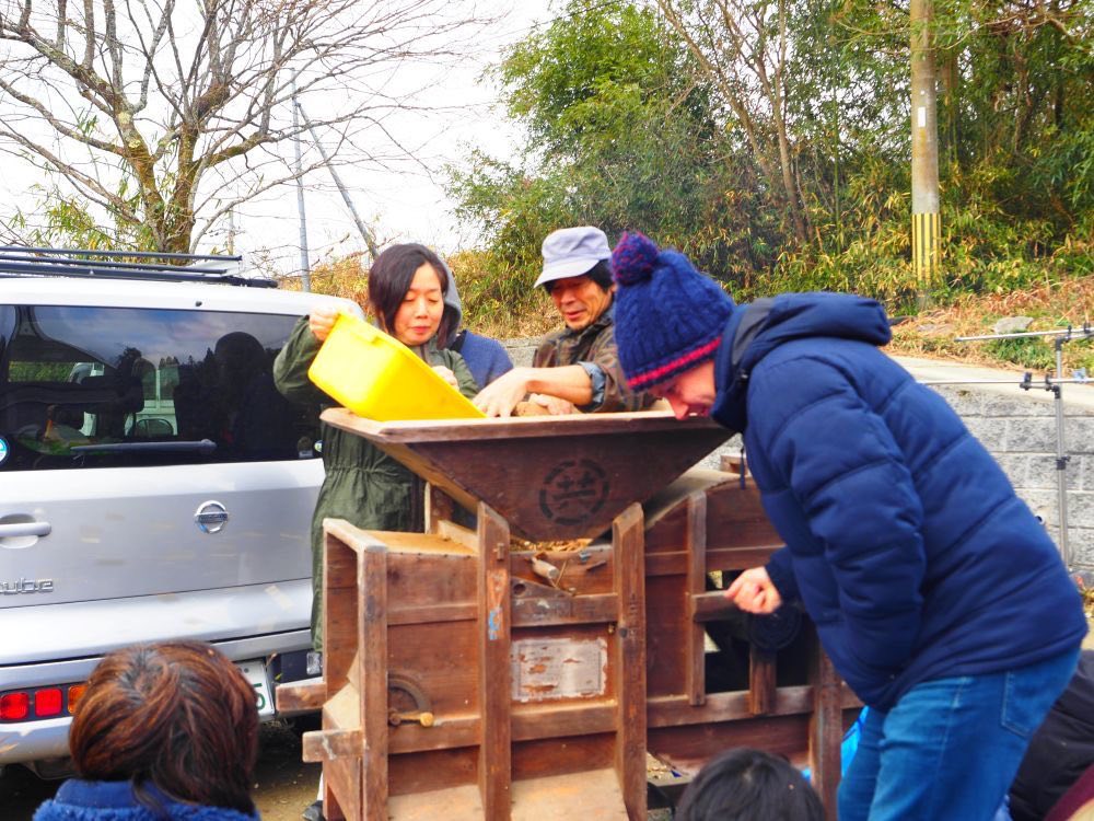 午前中のうちに、大豆の脱穀と選別にも取り組みました。脱穀には、風の力で軽いものを飛ばす「とうみ」という機械を使用しました。ハンドルの回転がそのまま風力に反映されるため、勢いが大切とのアドバイスを受け、速さを意識して回しましたが、次第に二の腕に疲労がたまり、一定のスピードを保つのが難しく感じました。