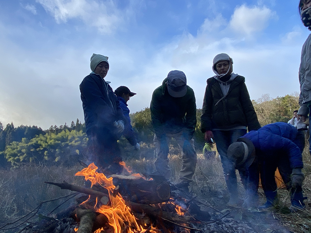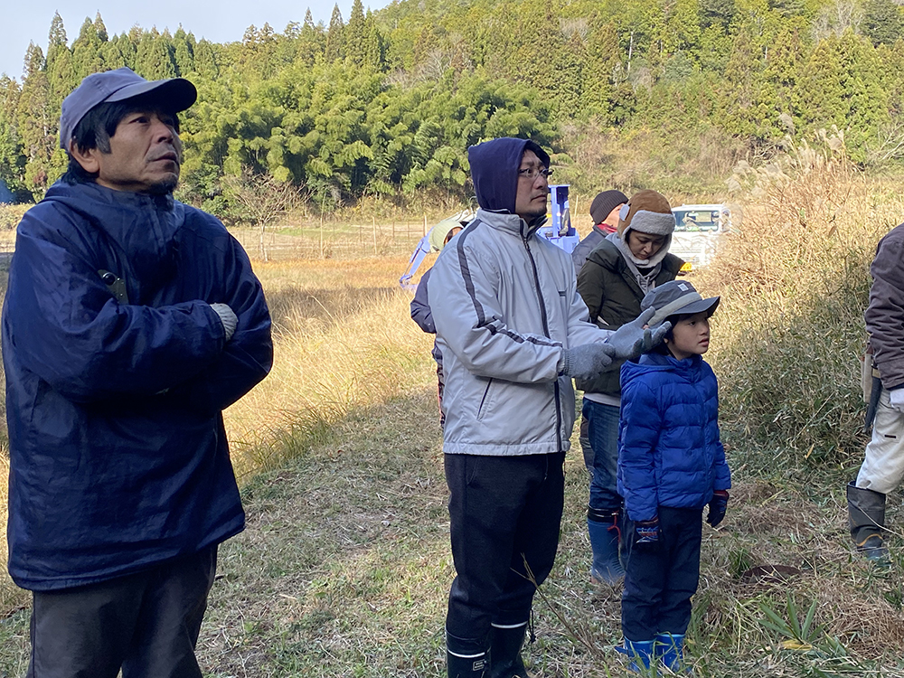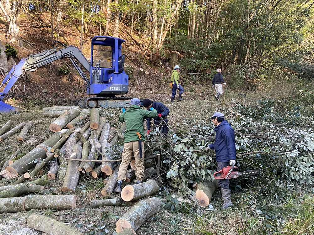今シーズン初の雪がちらつく中、山師の中島さん指導のもと、太い部分は薪に、直径が10〜20cmの部分は椎茸のホダ木として利用できるように里山の雑木を伐採しました。