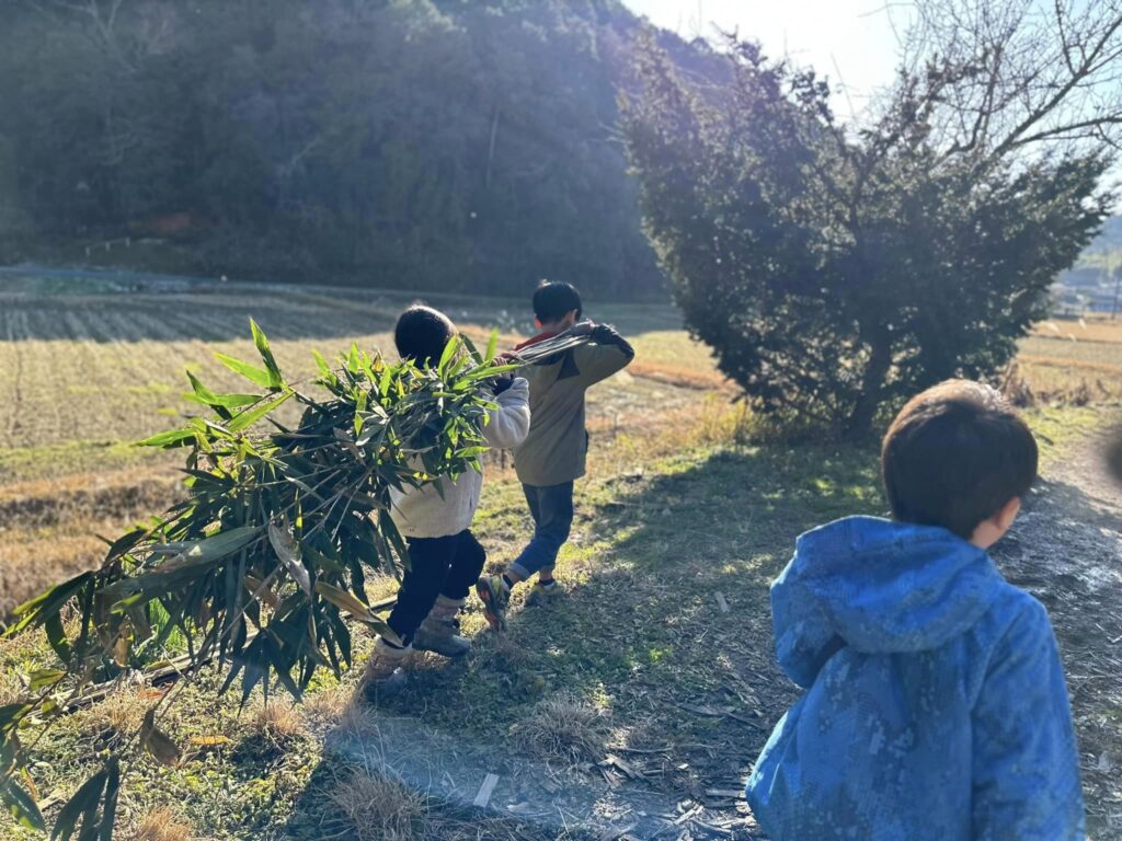 弓矢作りに夢中でした。材料は自分たちで