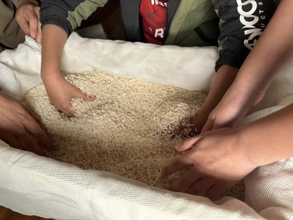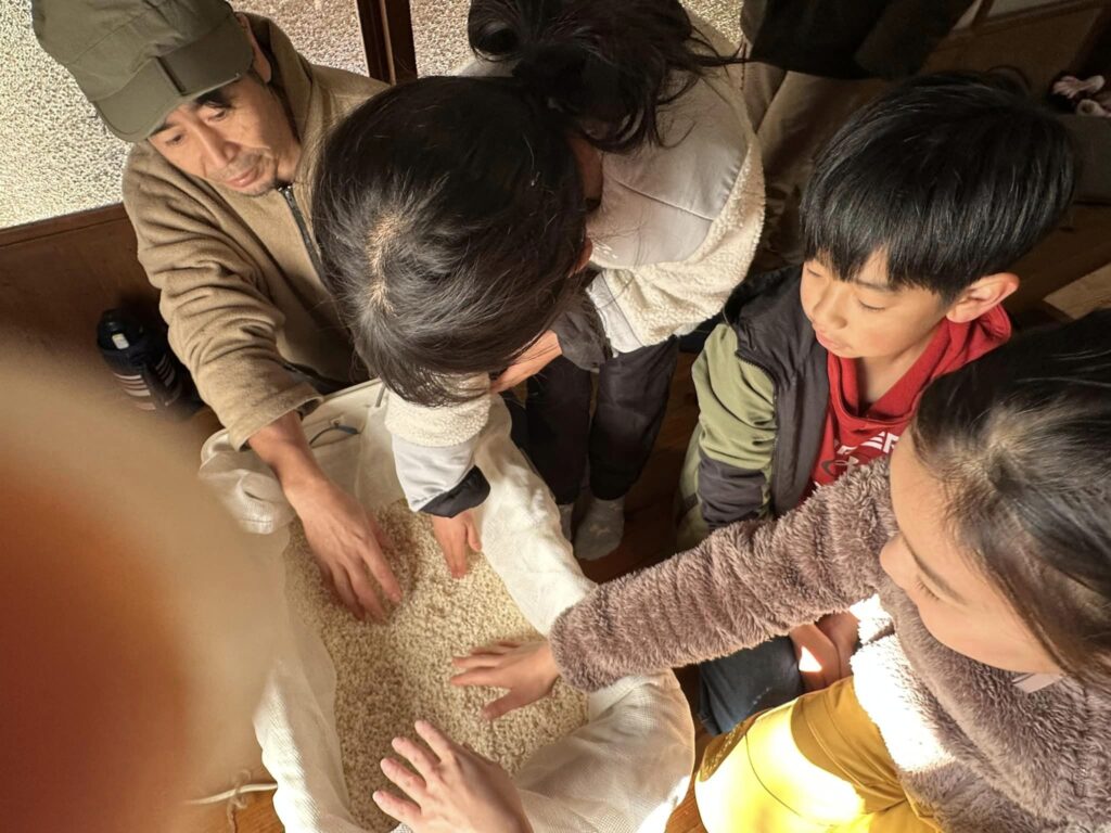 2日目は、朝に昨日仕込んだ麹の温度調整をするために1回目の切り返し(麹を混ぜる)をしました。そして2回目は昼に手入れ(麹を混ぜる)をしました。
